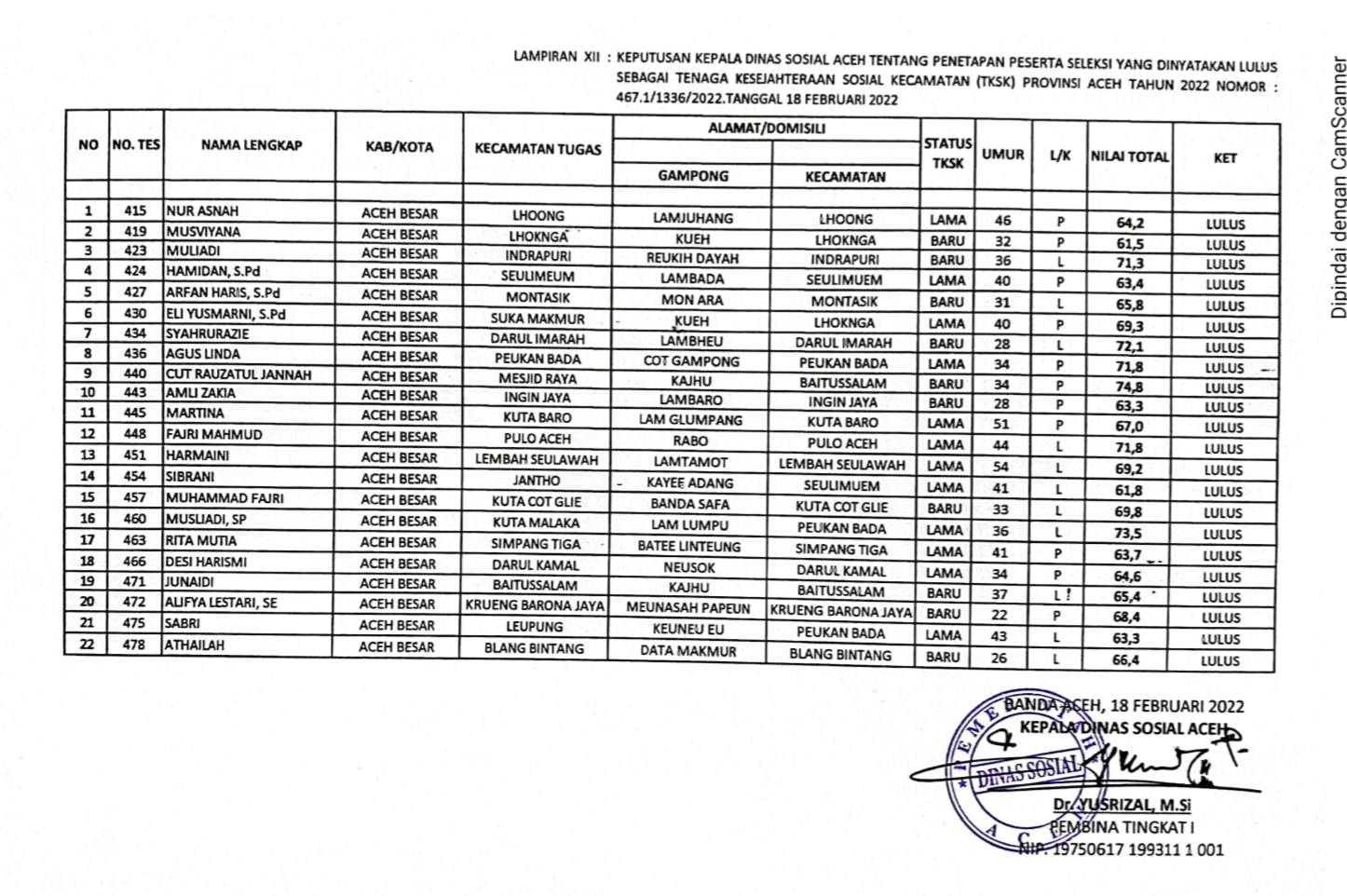 Berdasarkan hasil verifikasi administrasi Dinas Sosial Aceh merilis 3 nama di setiap Kecamatan di Kabupaten Aceh Besar dan dinyatakan berhak mengikuti seleksi Tulis dan wawancara.
