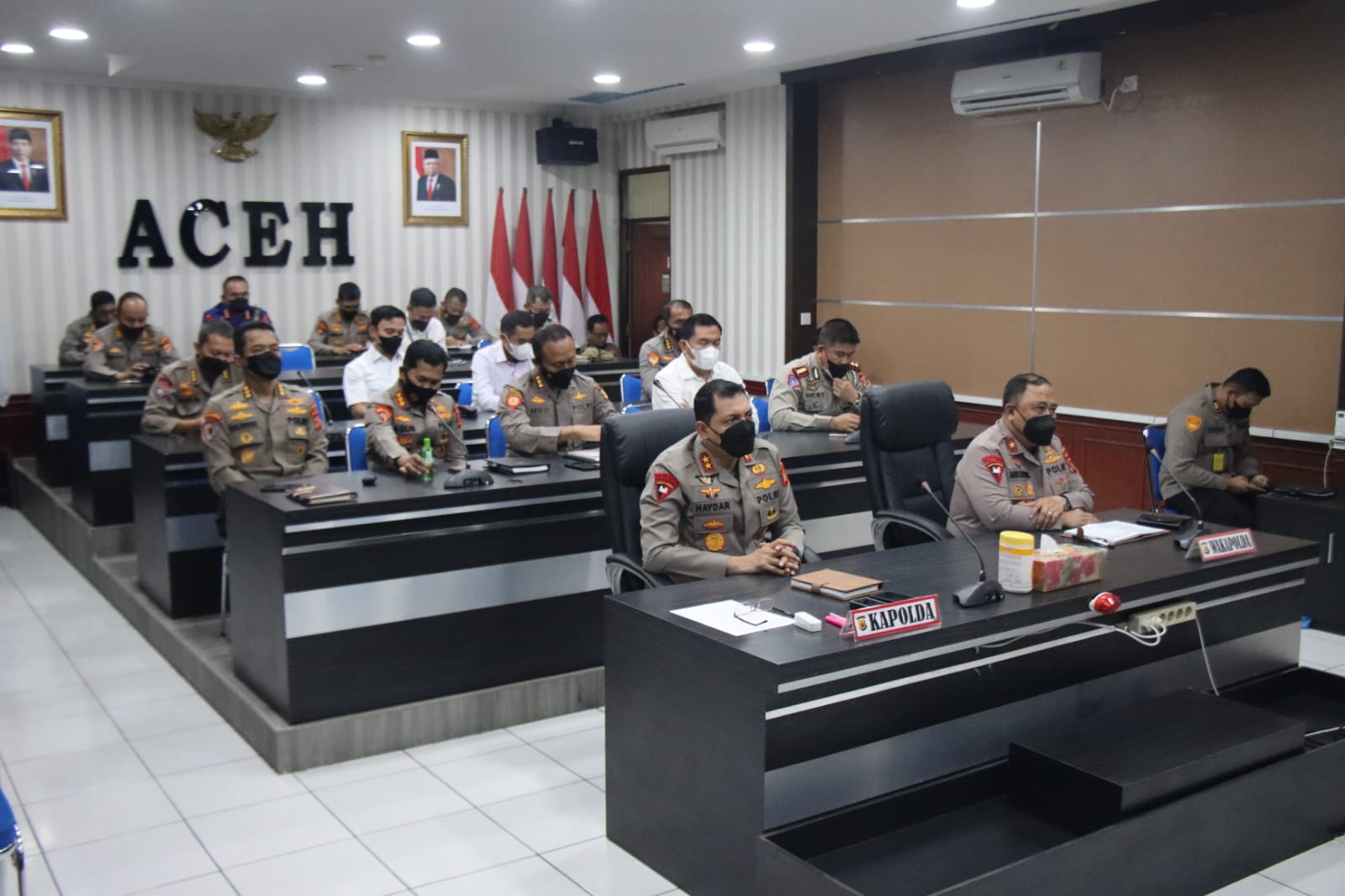 Lanjut Kabid Humas, Kapolda Aceh Irjen Ahmad Haydar, mengikuti langsung kegiatan itu di ruang vicon Lantai 2, Mapolda Aceh.