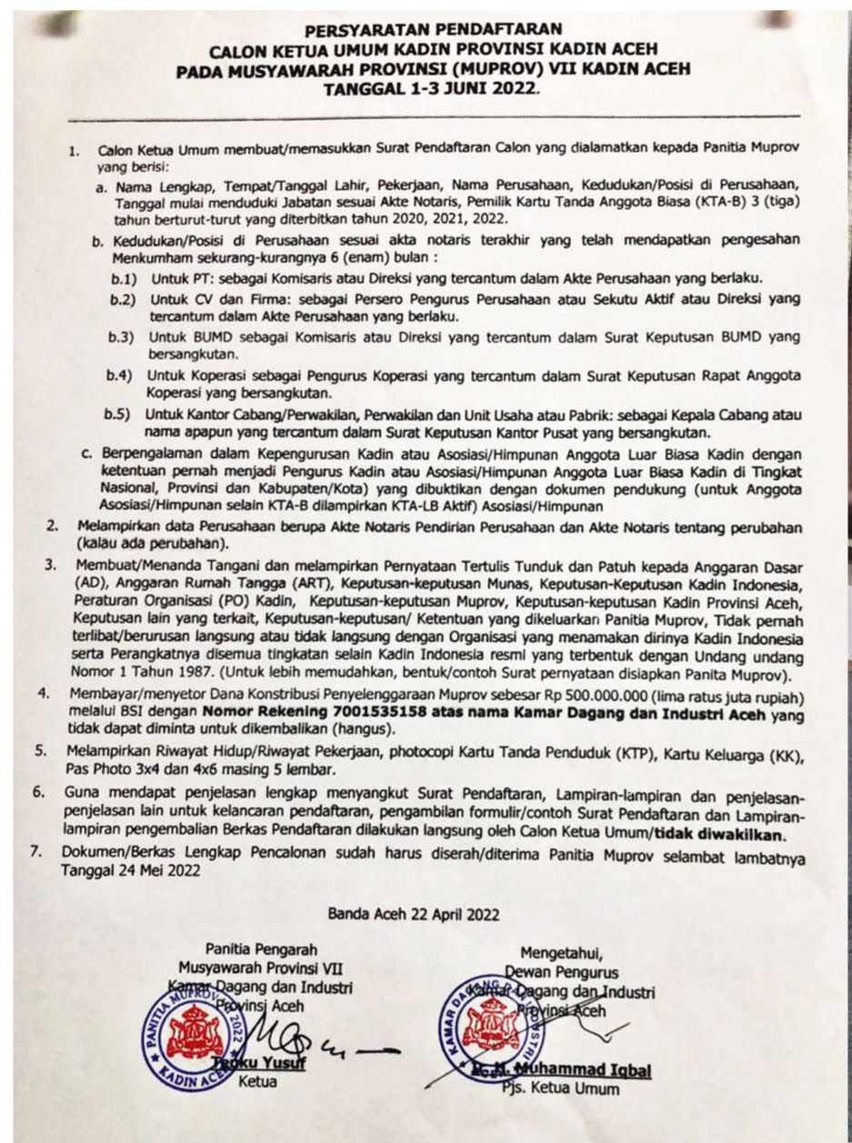 APJN.NET- BANDA ACEH – Genderang tanda Musyawarah Kadin Aceh VII mulai ditabuh, pengumuman pendaftaran serta persyaratan bagi calon ketua umum Kadin Aceh periode 2022 – 2027 sudah ditempel di papan pengumuman di kantor Kadin Aceh, kawasan Taman Makam Pahlawan sejak beberapa hari lalu.