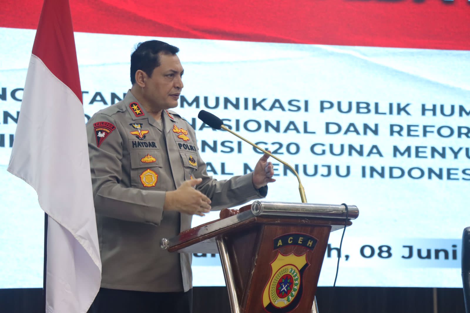 “Humas merupakan etalase Polri, khususnya Polda Aceh yang langsung berhubungan dengan masyarakat. Jadi, berikan yang terbaik,” kata Kapolda Aceh Irjen Ahmad Haydar, saat membuka Rakernis Bidhumas di Aula Presisi, Rabu, 8 Juni 2022.