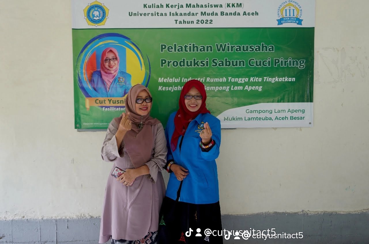 APJN.NET-ACEH BESAR- Mahasiswa KKM Universitas Iskandar muda (Unida) Banda Aceh, kelompok 3 Gampong Lam Apeng, Kemukiman Lamteuba, Kecamatan Seulimuem, Aceh Besar, selenggarakan program kerja (proker) pelatihan wirausaha produksi sabun cuci piring, bertajuk “Melalui Industri Rumah Tangga Kita Tingkatkan Kesejahteraan Gampong Lam Apeng”.