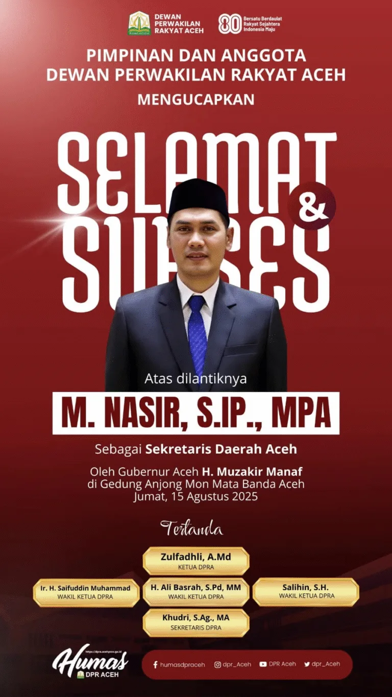 IKLAN DPRA – UCAPAN SELAMAT ATAS PELANTIKAN M. NASIR, S.IP., MPA SEBAGAI SEKDA ACEH Redaksi15 Agustus 20258 November 20257 views Pos terkaitIklan Bank Aceh Syariah – Ucapan Peringatan HPNIKLAN BIRO ADPIM SEKDA ACEH – UCAPAN SELAMAT HARI PAHLAWAN NASIONAL TAHUN 2025IKLAN DPRA – UCAPAN SELAMAT HARI PAHLAWAN NASIONAL TAHUN 2025IKLAN BPKA – UCAPAN SELAMAT HARI PAHLAWAN NASIONAL TAHUN 2025IKLAN WALI NANGGROE ACEH – UCAPAN DUKA CITA ATAS MENINGGALNYA BAPAK H. SURIPTO, SH (PENDIRI DAN KETUA UMUM KOMITE NASIONALUNTUK RAKYAT PALESTINA)IKLAN BPKA – UCAPAN SELAMAT DAN SUKSES MTQ KE XXXVII TAHUN 2025
