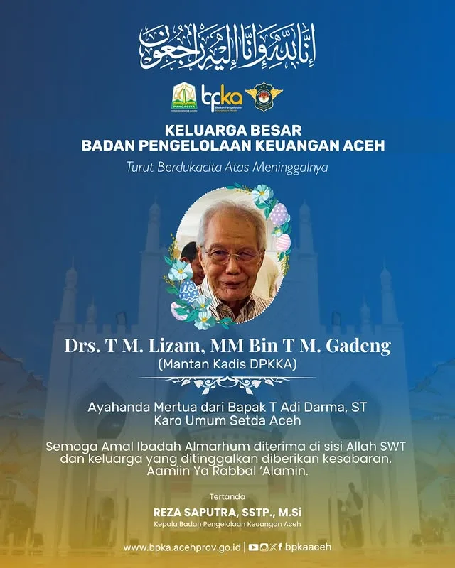 IKLAN BPKA – UCAPAN DUKA CITA ATAS MENINGGALNYA DRS. T.M. LIZAM, MM BIN TM GADENG admin13 September 20258 November 20258 views Pos terkaitIklan Bank Aceh Syariah – Ucapan Peringatan HPNIKLAN BIRO ADPIM SEKDA ACEH – UCAPAN SELAMAT HARI PAHLAWAN NASIONAL TAHUN 2025IKLAN DPRA – UCAPAN SELAMAT HARI PAHLAWAN NASIONAL TAHUN 2025IKLAN BPKA – UCAPAN SELAMAT HARI PAHLAWAN NASIONAL TAHUN 2025IKLAN WALI NANGGROE ACEH – UCAPAN DUKA CITA ATAS MENINGGALNYA BAPAK H. SURIPTO, SH (PENDIRI DAN KETUA UMUM KOMITE NASIONALUNTUK RAKYAT PALESTINA)IKLAN BPKA – UCAPAN SELAMAT DAN SUKSES MTQ KE XXXVII TAHUN 2025