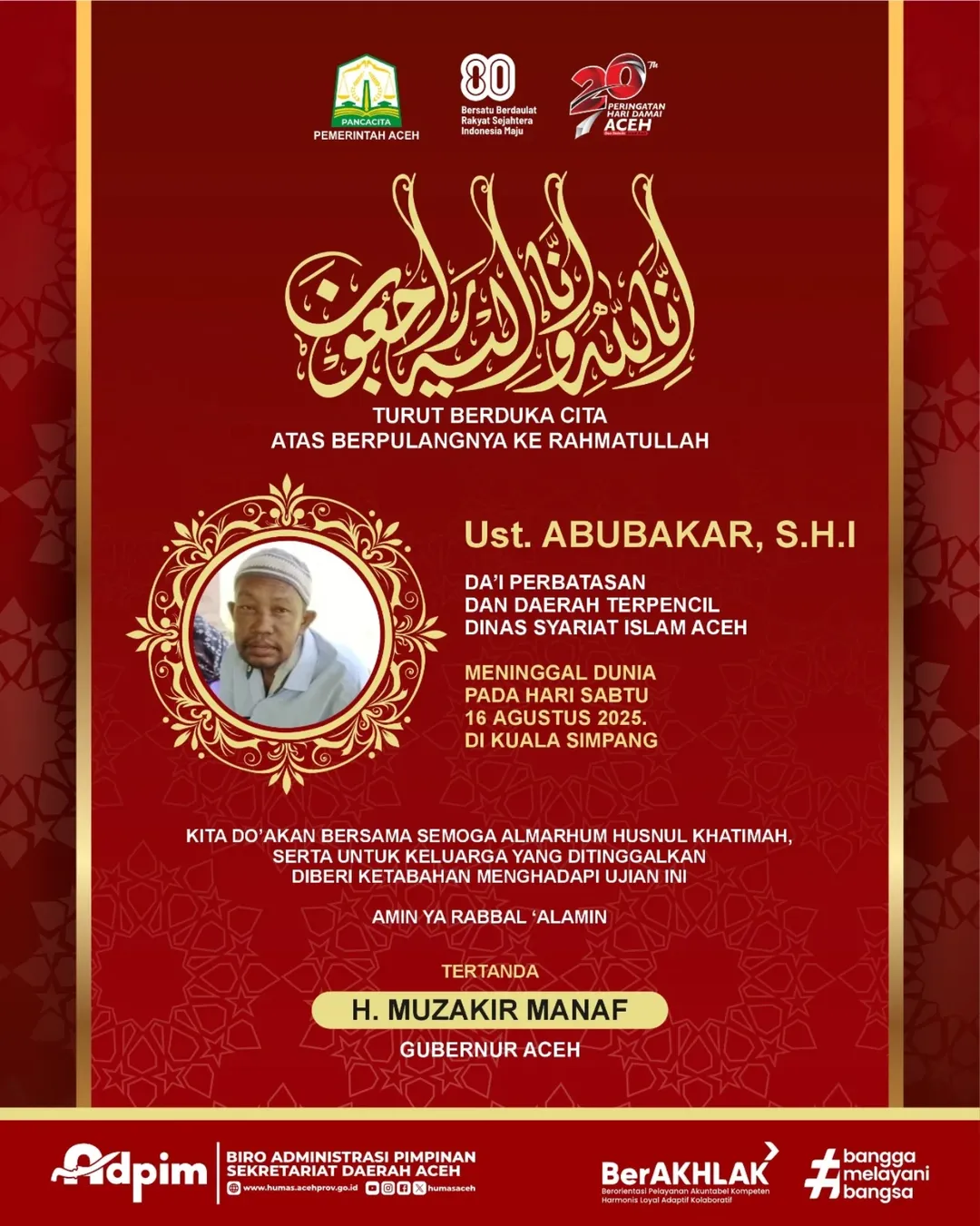 IKLAN BIRO ADPIM SEKDA ACEH – UCAPAN DUKA CITA ATAS MENINGGALNYA UST. ABUBAKAR, S.H.I (DA’I PERBATASAN DAN DAERAH TERPENCIL DINAS SYARIAT ISLAM ACEH) Redaksi16 Agustus 20259 November 20257 views Pos terkaitIklan Bank Aceh Syariah – Ucapan Peringatan HPNIKLAN BIRO ADPIM SEKDA ACEH – UCAPAN SELAMAT HARI PAHLAWAN NASIONAL TAHUN 2025IKLAN DPRA – UCAPAN SELAMAT HARI PAHLAWAN NASIONAL TAHUN 2025IKLAN BPKA – UCAPAN SELAMAT HARI PAHLAWAN NASIONAL TAHUN 2025IKLAN WALI NANGGROE ACEH – UCAPAN DUKA CITA ATAS MENINGGALNYA BAPAK H. SURIPTO, SH (PENDIRI DAN KETUA UMUM KOMITE NASIONALUNTUK RAKYAT PALESTINA)IKLAN BPKA – UCAPAN SELAMAT DAN SUKSES MTQ KE XXXVII TAHUN 2025