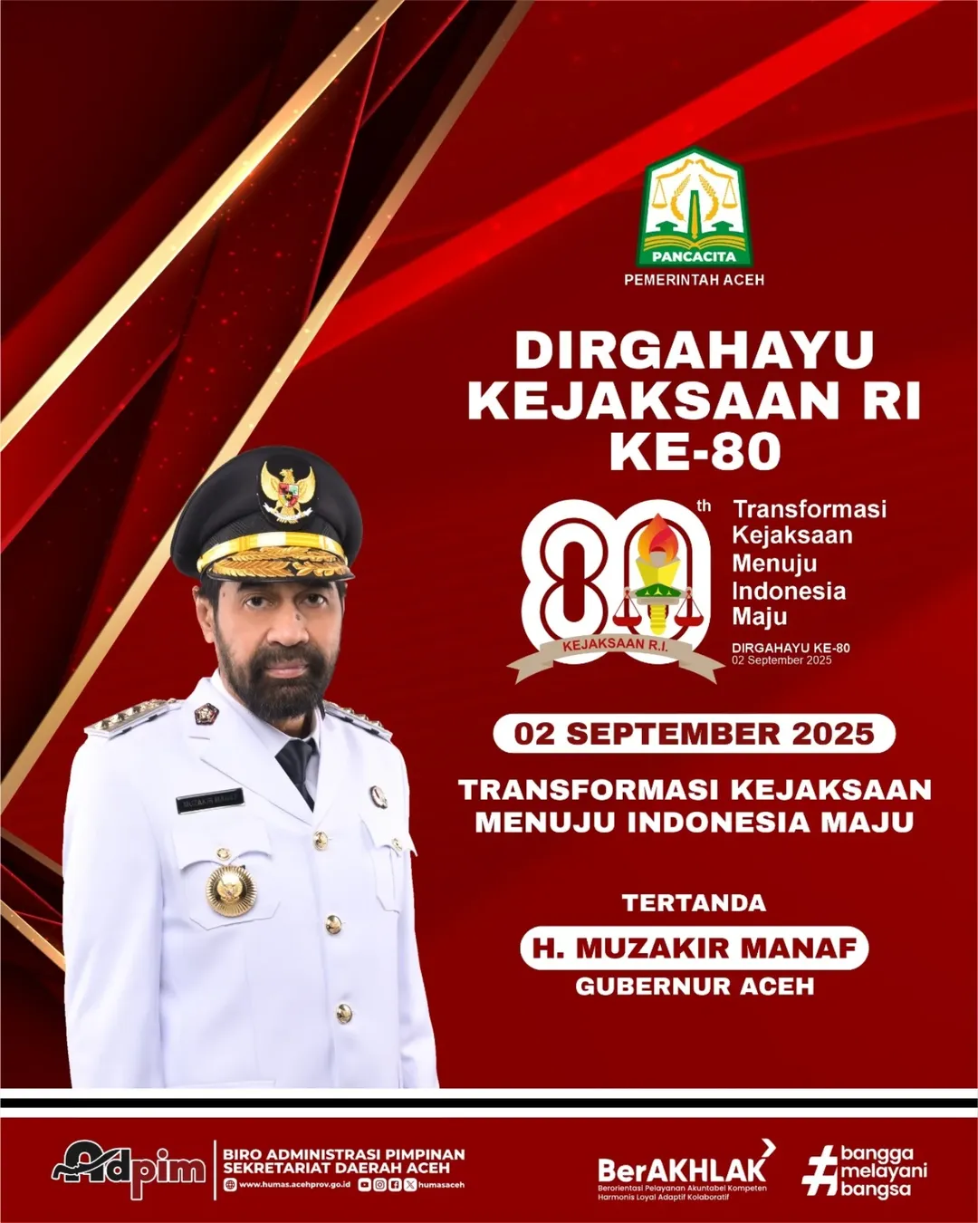 IKLAN BIRO ADPIM SEKDA ACEH – UCAPAN DIRGAHAYU KEJAKSAAN RI KE – 80 TAHUN 2025 Redaksi2 September 20259 November 20257 views Pos terkaitIklan Bank Aceh Syariah – Ucapan Peringatan HPNIKLAN BIRO ADPIM SEKDA ACEH – UCAPAN SELAMAT HARI PAHLAWAN NASIONAL TAHUN 2025IKLAN DPRA – UCAPAN SELAMAT HARI PAHLAWAN NASIONAL TAHUN 2025IKLAN BPKA – UCAPAN SELAMAT HARI PAHLAWAN NASIONAL TAHUN 2025IKLAN WALI NANGGROE ACEH – UCAPAN DUKA CITA ATAS MENINGGALNYA BAPAK H. SURIPTO, SH (PENDIRI DAN KETUA UMUM KOMITE NASIONALUNTUK RAKYAT PALESTINA)IKLAN BPKA – UCAPAN SELAMAT DAN SUKSES MTQ KE XXXVII TAHUN 2025