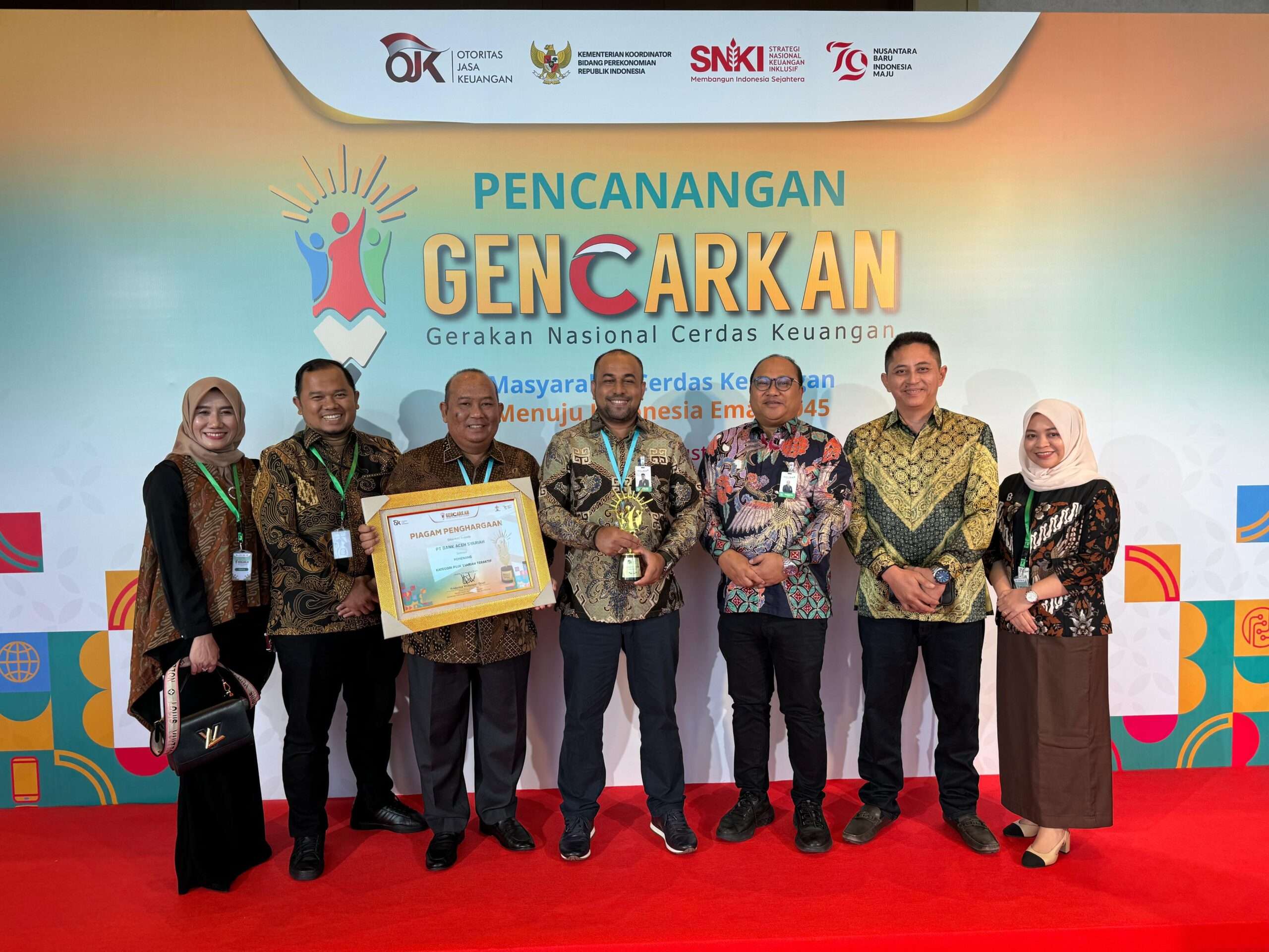 Penghargaan diserahkan oleh Airlangga Hartanto selaku Menteri Koordinator Perekonomian RI, Mahendra Siregar selaku Ketua Dewan Komisioner Otoritas Jasa Keuangan (OJK), Friderica Widyasari Dewi selaku Kepala Eksekutif Pengawas Perilaku Usaha Jasa Keuangan, Edukasi dan Perlindungan Konsumen yang diterima langsung oleh Plt. Direktur Utama Bank Aceh Fadhil Ilyas di Jakarta, 22 Agustus 2024.