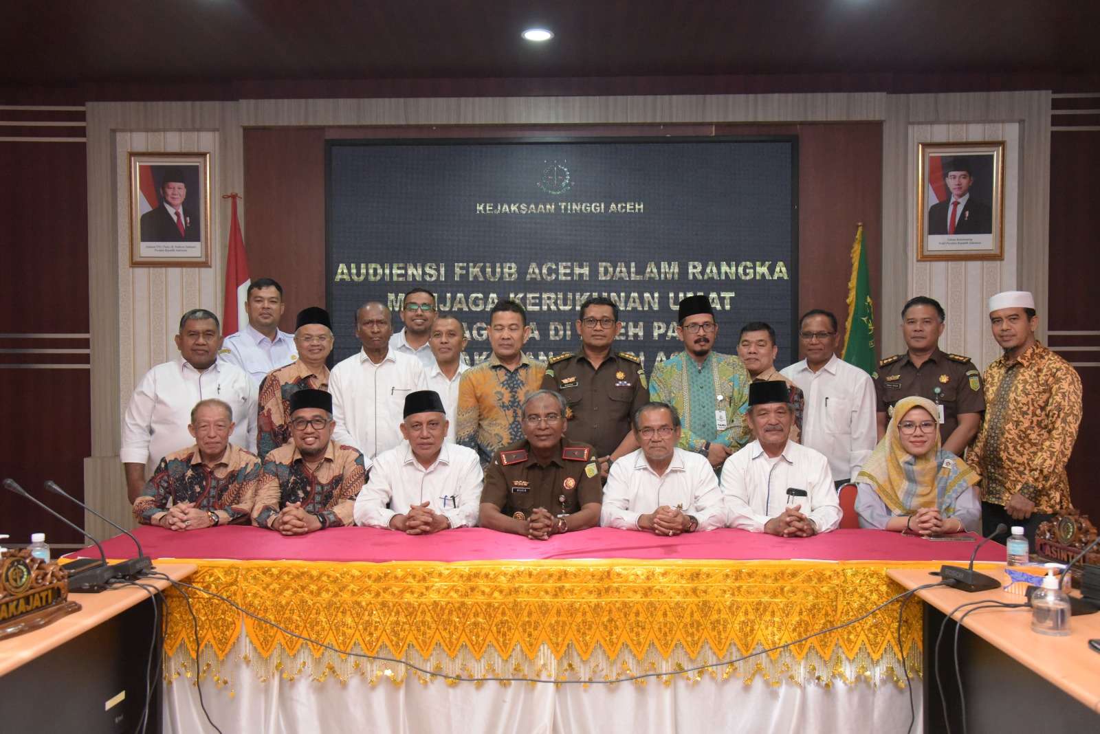 BANDA ACEH- Pelaksana Tugas (Plt) Kepala Kejaksaan Tinggi (Kajati) Aceh, Muhibuddin SH MH, menerima kunjungan audiensi dari Pengurus Forum Kerukunan Umat Beragama (FKUB) Aceh, di Kantor Kejati Aceh, Banda Aceh, Rabu (8/1/2025).