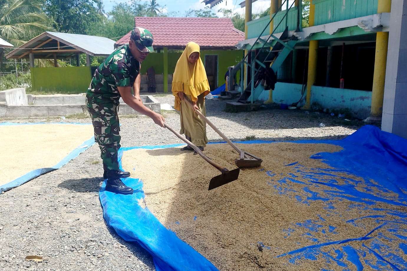 Di bawah terik matahari siang, halaman rumah salah seorang warga Gampong Lamjreun tampak penuh dengan hasil panen padi yang sedang dijemur, dengan senyum ramah, Sertu Wawan mengayunkan serok kayu untuk membalik butiran padi yang terhampar.