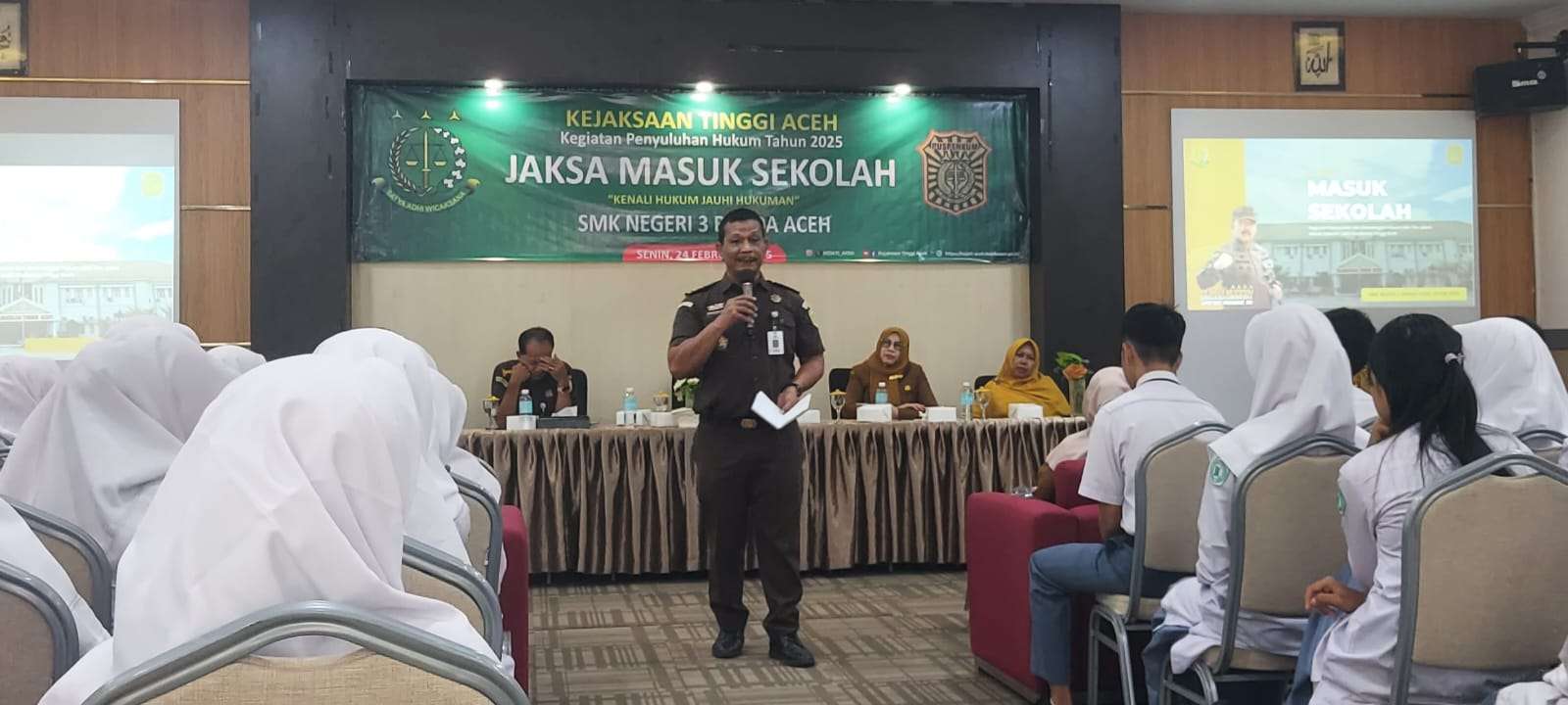 BANDA ACEH, Tim Penyuluhan Hukum Kejaksaan Tinggi (Kejati) Aceh mengunjungi SMK Negeri 3 Banda Aceh dalam rangka program edukasi hukum melalui kegiatan Jaksa Masuk Sekolah (JMS), Senin (24/2/2025).