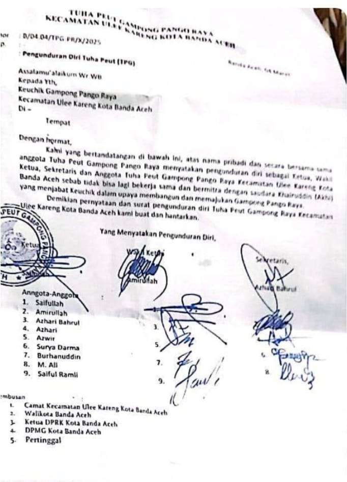 Pengunduran secara berjamaah tersebut dilakukan karena tidak bisa kerjasama dengan Keuchik, dan hal itu tertuang dalam surat B/04.04/TPG:PR/X/2025, turut di tembuskan kepada Camat Ulee Kareng Kota Banda Aceh, Walikota Banda Aceh, Ketua DPRK Banda Aceh, dan DPMG Kota Banda Aceh.