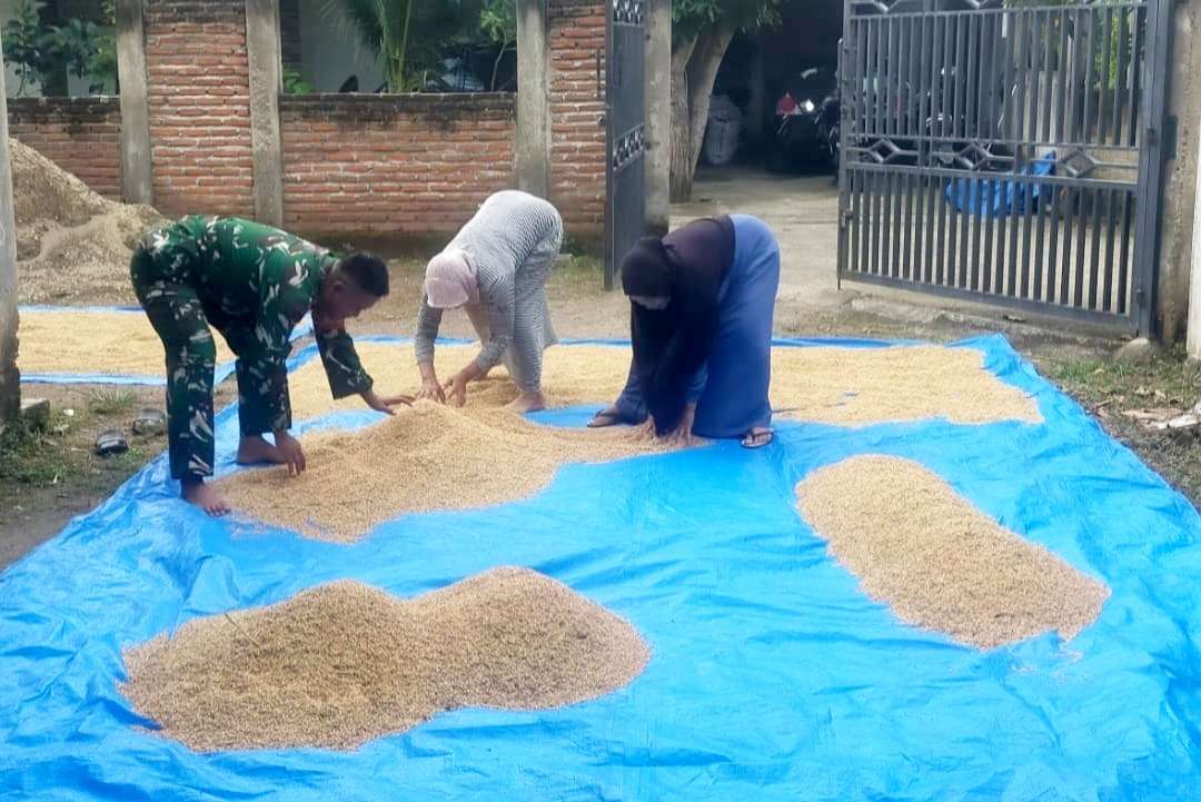 ACEH BESAR–Sertu Nurdiana, Babinsa Gampong Bak Buloh dari Koramil 08/Kuta Baro, Kodim 0101/Kota Banda Aceh, dengan cekatan membantu seorang warga, Ibu Saidah, menjemur gabah hasil panen di halaman rumahnya, Kamis (17/4/2025).