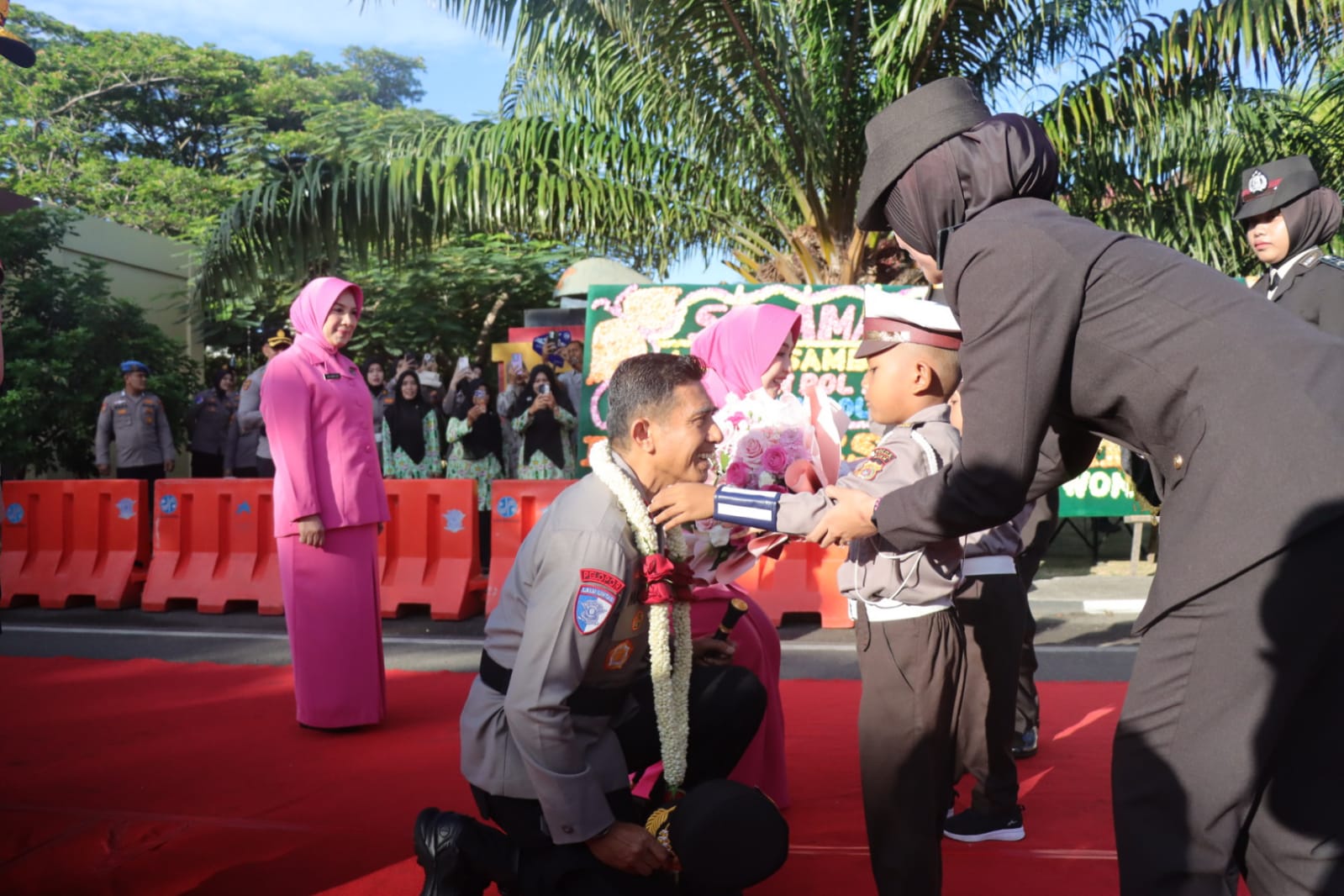 Brigjen Marzuki Ali Basyah dan istri disambut dengan pengalungan bunga oleh polisi cilik sebagai bentuk penghormatan.
