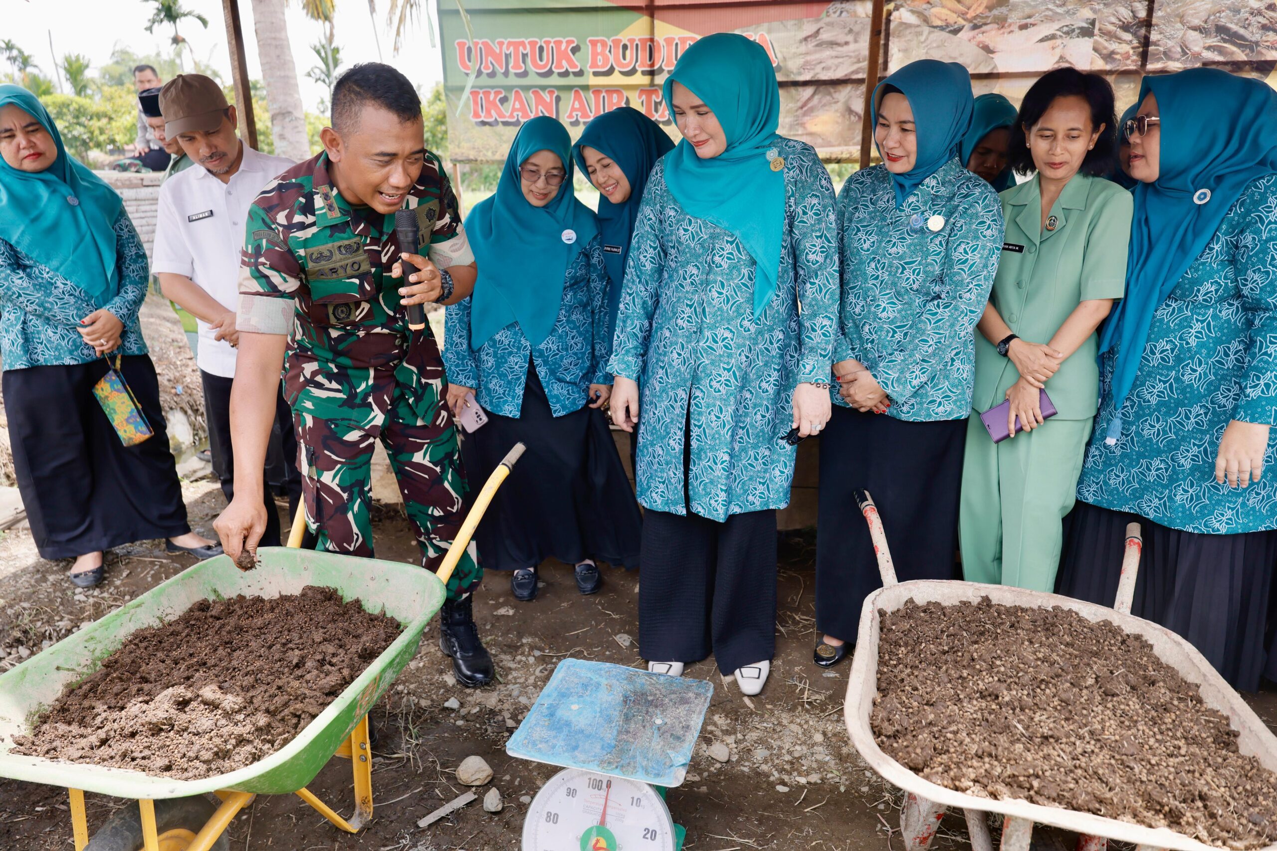ACEH TENGGARA – Ketua TP-PKK Aceh, Ny. Marlina Muzakir, bersama Bupati Aceh Tenggara, H. M. Salim Fakhry SE, MM, Ketua TP-PKK Aceh Tenggara, H. Nurjanah Fakhry, Dandim 0108/Agara, Letkol Czi Arya Murdyantoro ST, serta Kepala Dinas Kelautan dan Perikanan Aceh, Aliman S.Pi. MSi, meninjau inovasi pakan organik ikan laut tawar di Desa Lawe Pangkat, Kecamatan Deleng Pokhisen, Kabupaten Aceh Tenggara, Rabu (27/8/2025).