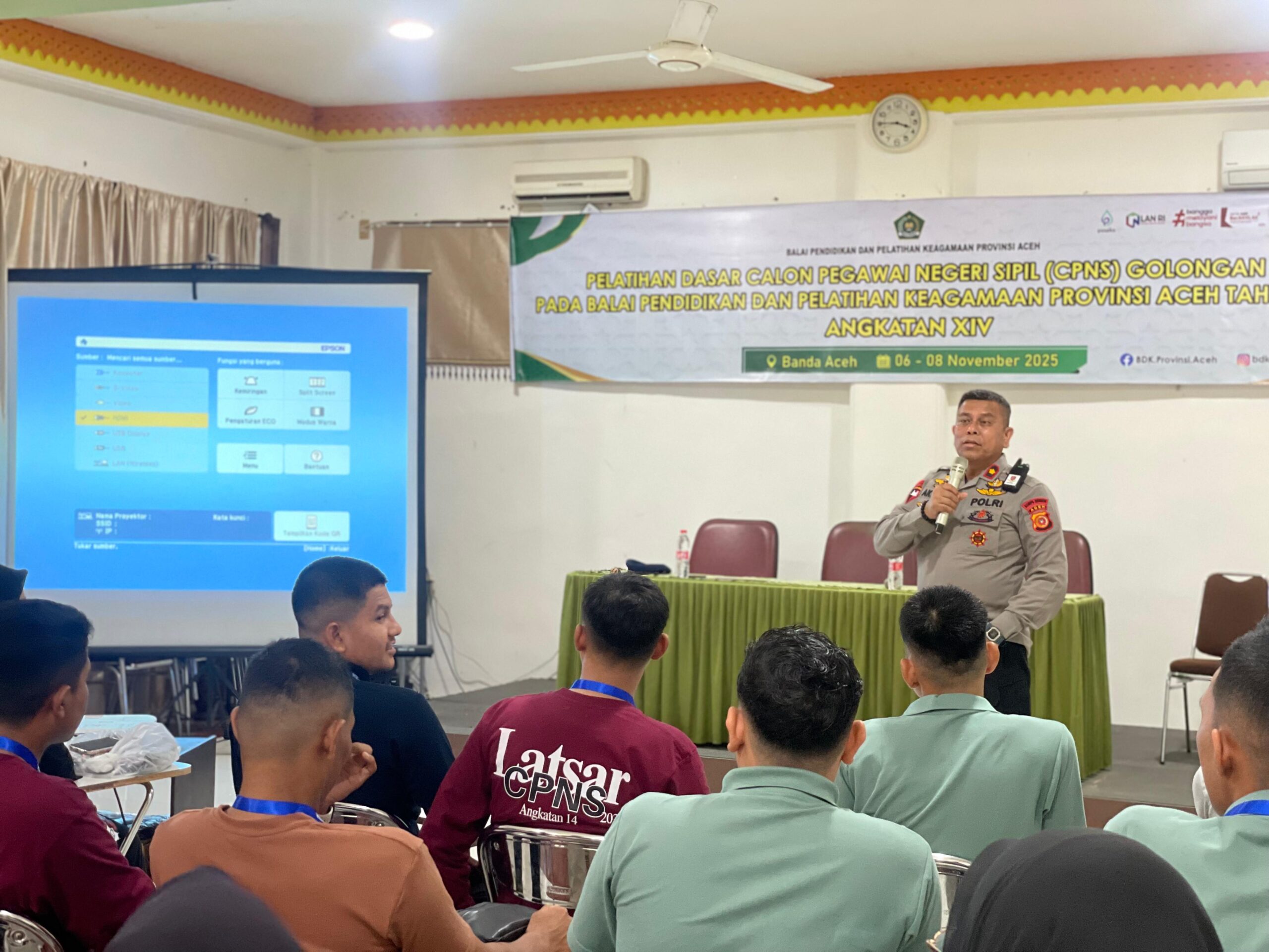 BANDA ACEH – Dalam rangka memperingati HUT ke-80 Korps Brimob Polri, Komandan Satuan Brimob Polda Aceh Kombes Pol Zuhdi Batubara, S.I.K., M.Han. menugaskan Komandan Detasemen Gegana Satbrimob Polda Aceh, Kompol Akmal SE, MM, sebagai narasumber kuliah umum materi Bela Negara pada kegiatan Diklat Dasar (Diksar) CPNS di Banda Aceh, Kamis (6/11/2025).