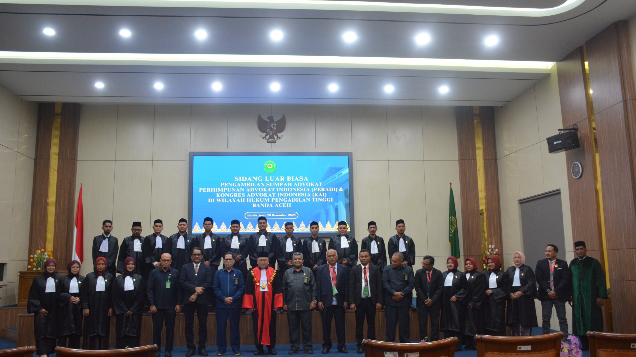 BANDA ACEH – Ketua Pengadilan Tinggi (KP) Banda Aceh, Nursyam SH, MHum, mengambil sumpah 20 orang Advokat yang berasal dari Perhimpunan Advokat Indonesia (Peradi) dan Kongres Advokat Indonesia (KAI) di Ruang Sidang Utama Pengadilan Tinggi, Selasa (23/12/2025).