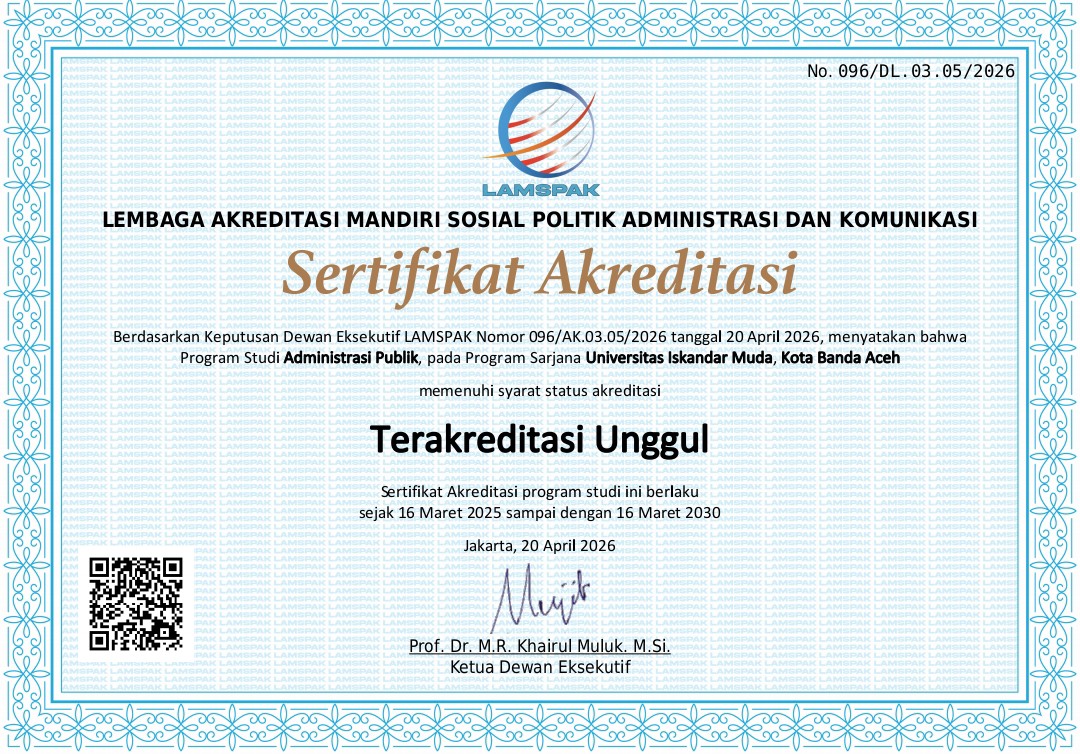 Dalam keputusan tersebut, Program Studi Administrasi Publik jenjang Sarjana di Unida dinyatakan memenuhi syarat untuk memperoleh status akreditasi “Unggul” yang berlaku mulai 16 Maret 2025 hingga 16 Maret 2030. Keputusan itu ditandatangani oleh Ketua Dewan Eksekutif LAMSPAK, Prof. Dr .M. R. Khairul Muluk.M.Si.