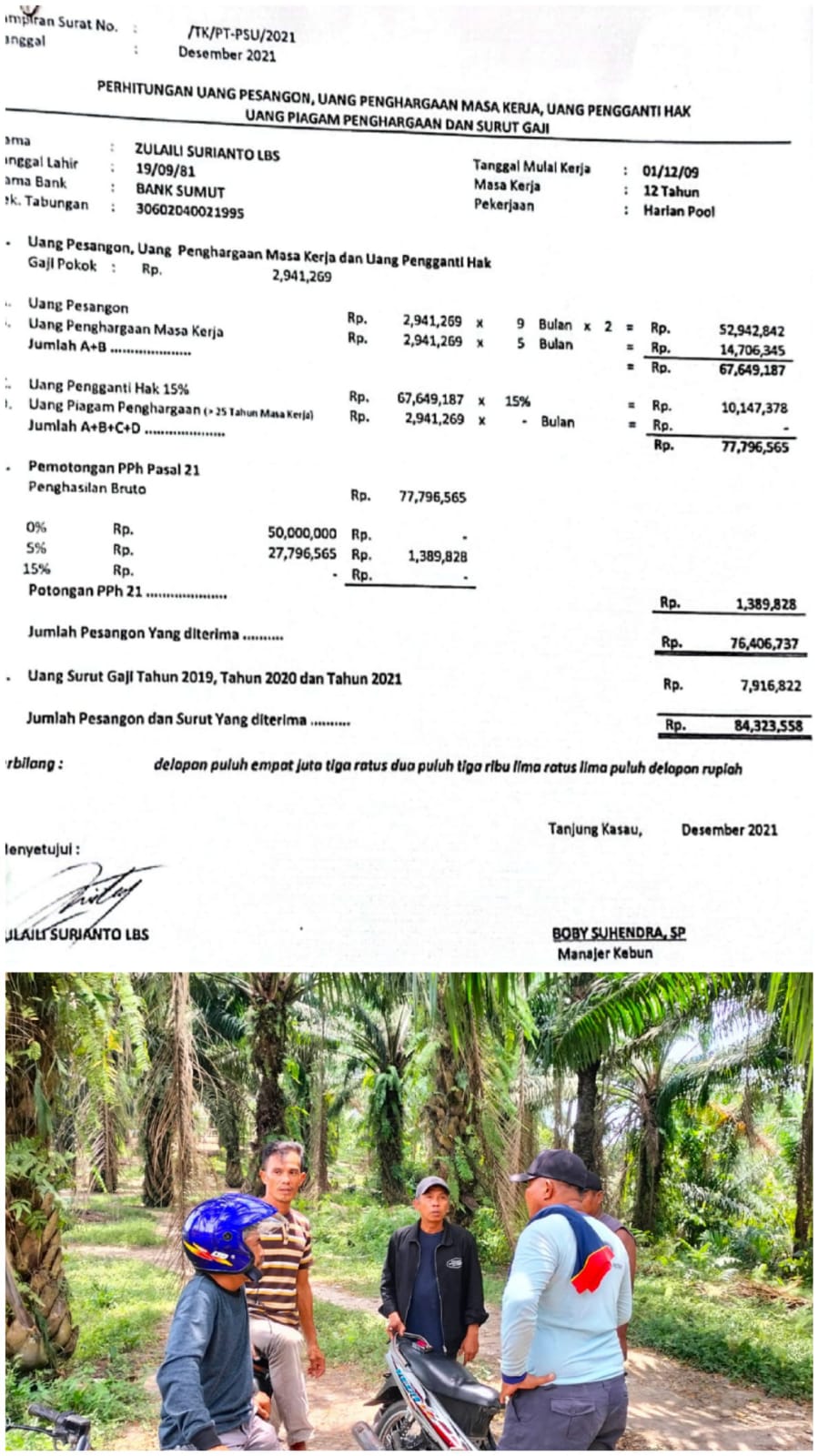 Zulaili Surianto Lubis, Manaraji, Zulhendri yang didampingi Karyawan lainnya ini pada Selasa (22/2/2021) di Desa Tanjung Kasau, mengatakan, pihaknya telah di telepon asisten PT PSU untuk hadir ke kantor kebun Tanjung Kasau untuk menandatangani surat Rasionalisasi Perhitungan Uang Pesangon. Namun, sampai saat ini kami belum juga menerima uang Rasionalisasi tersebut.