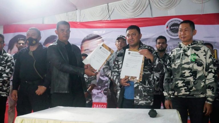 Ketua Umum Barisan Pemuda Nusantara (BAPERA) Fahd El Fouz Arafiq menyerahkan Seluruh Peserta Jambore Nasional Bela Negara BAPERA seluruh Indonesia kepada AKBP Ahmad Setiadi, S.I.K. DanLat Brimob di Bumi Perkemahan Cibubur, jalan Kawista Pondok Rangon, Kecamatan Cipayung, Jakarta Timur, untuk dididik Satuan Brimob, Rabu malam (23/2’22).